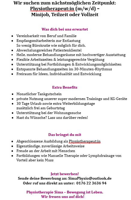 Meine Praxis liegt zentral in Regensburg und ist gut erreichbar. Ich komme aber auch gerne zu Ihnen nach Hause. Vereinbaren Sie einen Termin, um mehr über mein Leistungsangebot und meine Philosophie zu erfahren. Ich freue mich darauf, Sie auf Ihrem Weg zu mehr Gesundheit und Wohlbefinden zu begleiten. Vertrauen Sie auf meine Expertise – Ihre Physiotherapiepraxis Sima in Regensburg.